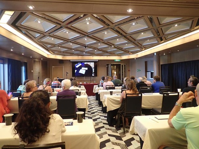 Previous Holland America cruises we’ve taken had guest lecturers. Some on itinerary-related subjects and others on random things. There were no guest lecturers on this cruise. Instead the cruise director gave several presentations on itinerary-related subjects. She also had a lot of other duties to perform. She introduced the nightly shows and had other activities she was in charge of as well as whatever regular cruise director duties involve. I hope they paid her well since she had to work so hard. She also did the port talks, which on previous cruises were either guest lectures with things about the port or shore excursion staff talking about different excursions offered at that port. Usually some of each. There were also health or fitness related lectures offered at the gym, something the cruise director didn’t have to do since the gym staff took care of those.