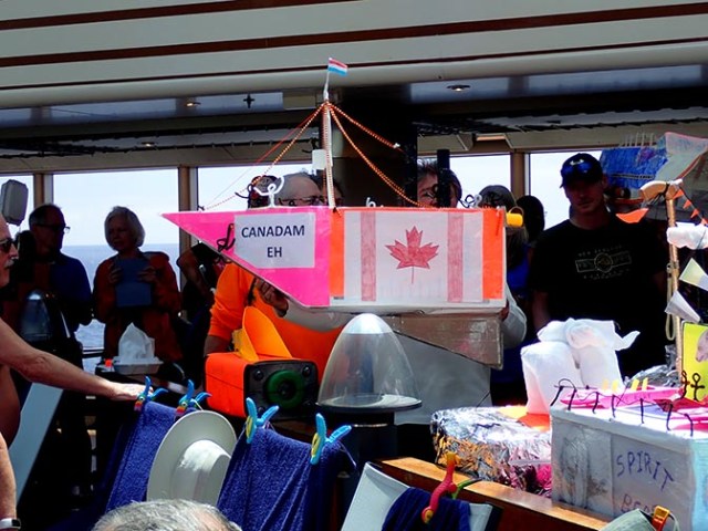 The biggest competition of the cruise is the ship building contest. People could sign up to build little boats that would later be tested in the pool to see if they could float. I’d only seen that once previously on the Oosterdam Antarctica cruise where there were just 3 entries that people made all on their own. On Nieuw Amsterdam they had boat building sessions with crew to help people make their entries and they ended up with a whole lot of teams with quite a variety of different boats. They had quite a few sessions to work on them before the competition. The boat creating sessions were just for the participants, but the trials were open for everyone to watch.