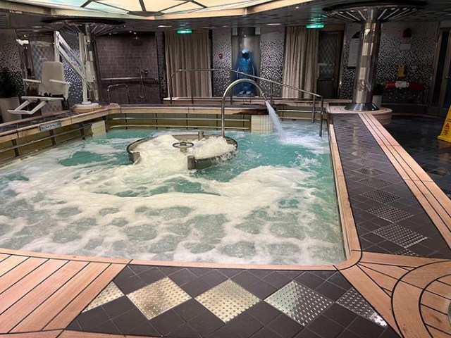 There’s always a variety of things to do on a cruise ship. Some ships have more things to do on your own and others more scheduled activities, but they all have some of each. Standard on every cruise ship are things like swimming pools and hot tubs. Holland America Niew Amsterdam has 2 public swimming pools. There’s also a hydrotherapy pool for people who pay for the thermal suite in the spa. The ship also has hot tubs next to the public pools. Usually pools on the Nieuw Amsterdam are open in the daytime for people to swim in as they wish, but occasionally there’s a scheduled event at one of the pools. The back deck pool is always outside, but the main Lido pool has a sliding cover so it can be inside or outside depending on the temperature and weather.