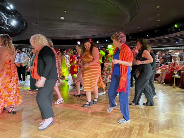 Some of the other classes offered included ballroom dancing, line dancing, tai chi, pickleball, yoga, and tech for travelers. We tried the line dancing a couple times. Even if you’re not very good at it it’s really good exercise. Holland America always has an orange themed day once during the cruise. Orange is the color of the House of Orange-Nassau which is the royal family of the Netherlands. On this cruise the orange day coincided with the actual King’s birthday celebration in Holland. On Holland America’s orange day people dress in orange at dinner and then there’s an orange party in the evening. They opened the orange party with line dancing, with dances people learned from the lessons. We only went a couple times to the lessons and only knew one easy dance, but Linda did a pretty good job following along on some of the more difficult ones that came after.