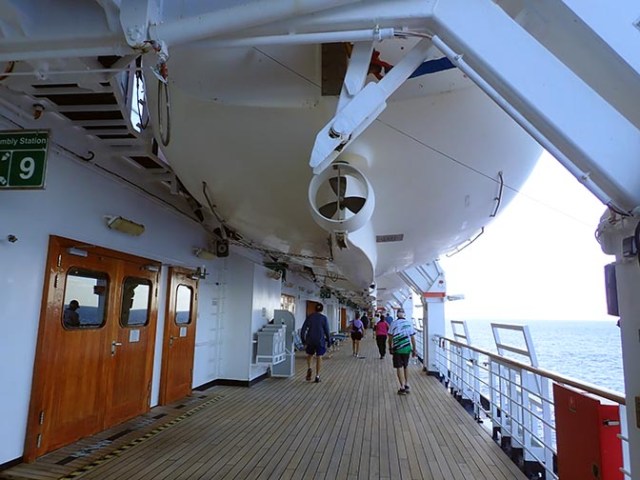 The promenade deck goes all the way around the ship, which is a nice feature on Holland America’s ships that not all ships of all cruiselines have. It’s a popular place for people to walk around. There’s also some deck chairs on the promenade deck which are prime choices for lounging in the shade since most of the ship’s deck chairs are out in the sun on upper decks. We spent a few lazy afternoons lounging in the deck chairs with a book and a daiquiri there. We also took quite a lot of walks around the promenade. We did try the gym, but the promenade was preferable for exercise. The gym has a view if you happen to be in the row by the front window, but the promenade has fresh outside air and a better view.