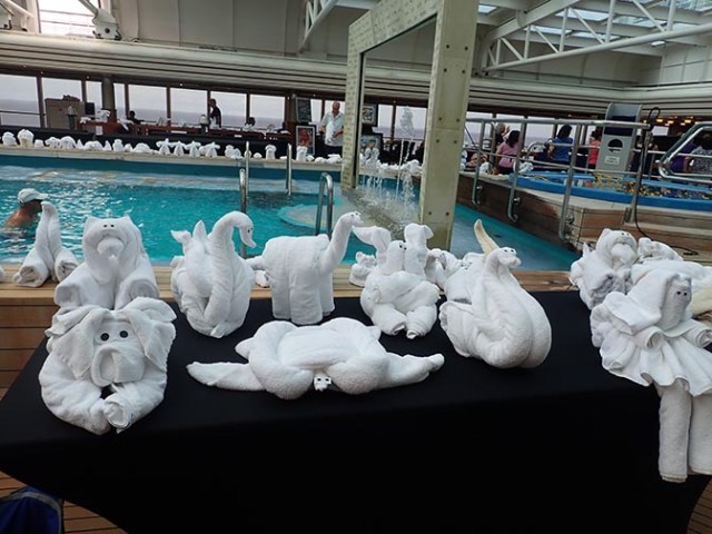 Besides daily activities there were also some one-time events and activities. The towel animal takeover on the Lido deck on this ship went beyond the usual conglomeration of towel animals covering the Lido deck. They added in fruit carvings, origami, baked bread animals, napkin folding, and a sales event with merchandise from the ships shops set up in booths on the Lido. Eventually they handed out some cake and fruit samples at the fruit carving booth, but it wasn’t open yet when we went through there to see all the towel animals. They were also still working on the fruit carvings then.