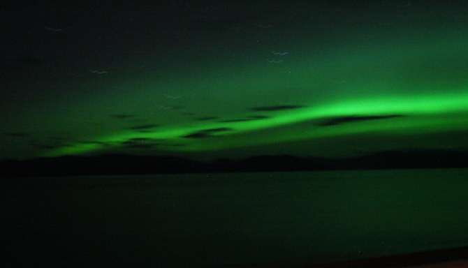 horizon. If watched for a bit, the light would radiate and grow before shrinking back to its original glow, only to project skyward once again. The northern lights at last, one of the things I really wanted to see. John said it would take setting the camera up on a tripod for a long exposure to get a picture of them, which he did not do, but Kevin and Abby did.