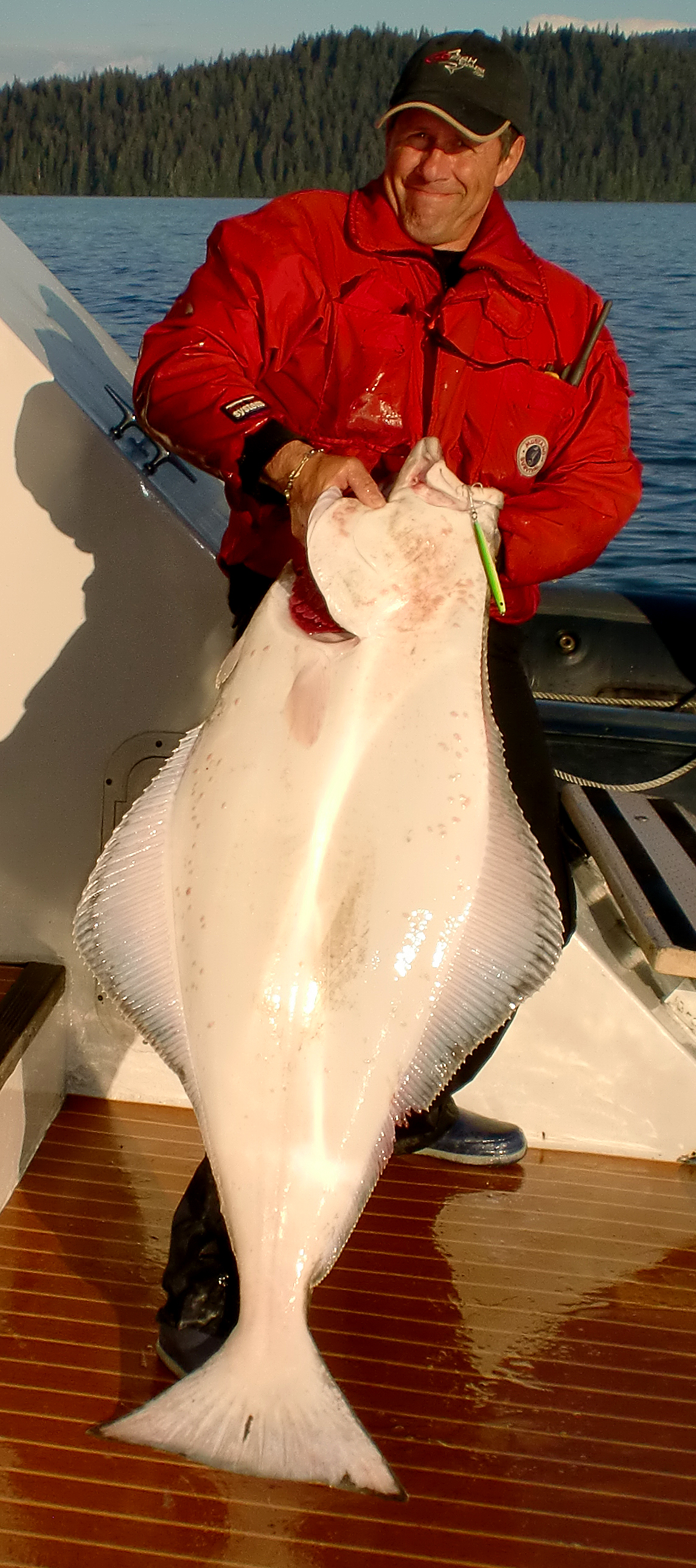 kayak as he was there as well.) All grumblings were forgotten as people who had never seen a halibut before marveled over his 60-pound fish, caught on a 3 1/2 oz pearl green Point Wilson dart. Dinner that night was already in the works, so we had halibut tacos for lunch the next day with plenty left over for another meal.