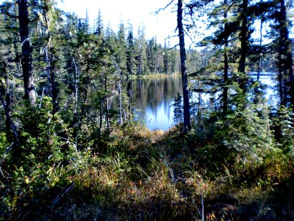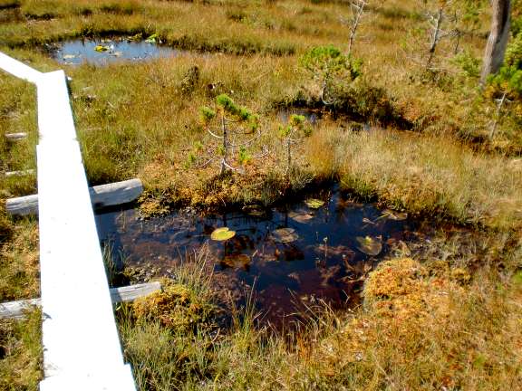 However the boards got there, it is amazing that someone built boardwalk trails in the middle of nowhere. They must get some maintenance as well, or there would be a lot more broken and submerged boards than there are. Through the peat bogs, there are places where some will have boards 2 to 3 high and others do not. A few either have a bit of water running across or squish down into the bog when stepped on and get water over the top. Probably the next candidates for stacking one board higher. Some boards even have fish net stapled over them for traction.