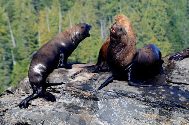 On the return trip to Yes Bay we stopped near a rocky point. We aimed our cameras at a group of sea lions sunning themselves on the rock. The males sat up and scratched themselves. They barked loudly and fought halfheartedly. The females ignored the males’ shenanigans and basked almost statue-like quietly soaking up the rare sunshine.
