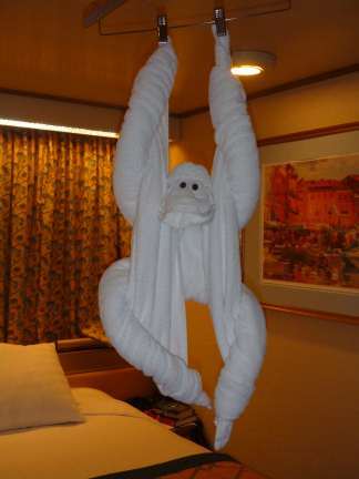 As anyone who has ever cruised knows, every night you return to your room  to find a new towel animal created by your cabin boy. At Thanksgiving time, I posted a picture of a towel turkey from my recent Holland America Westerdam cruise on my facebook. Lauren of Australia posted a towel elephant saying she trumped my towel turkey. So I want to know, does the towel elephant really trump the towel turkey? How about the hanging towel monkey from the Westerdam.  Does it trump the towel elephant from somewhere in Australia?
