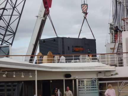 leave – nobody gets seasick! Our ship was scheduled to leave a bit later than most, but left a lot later than that. The backup generator did not pass the coast guard inspection upon returning to America from the Westerdam’s previous cruise in Europe. As fixing it would take several days, they brought in a temporary one and made modifications to place it on deck. The generator arrived on time. Problem was, the crane could not lift it. It took until the next morning to get a larger crane, so we had about a 16 hour delay before departing.