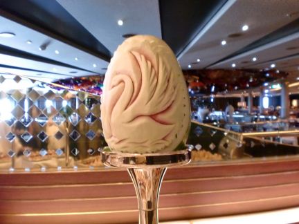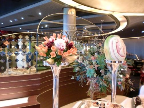 Delicately carved watermelons atop poles, and bouquets of sugar flowers adorned tables overflowing with numerous fancy treats. What to pick? I tried a cucumber sandwich, about as traditional a tea treat as I have ever heard of. A cream puff swan and tiny chocolate cake joined the sandwich. What is that hollowed out flakey biscuit thing? Does the soup go in it? Yes, OK I’ll try one of those. I might have been a bit greedier if it was serve yourself, but that seemed like enough for point at the food you want and somebody puts it on your plate service. A good way to keep from putting on those extra cruise ship pounds as well as halt the spread of germs I think.