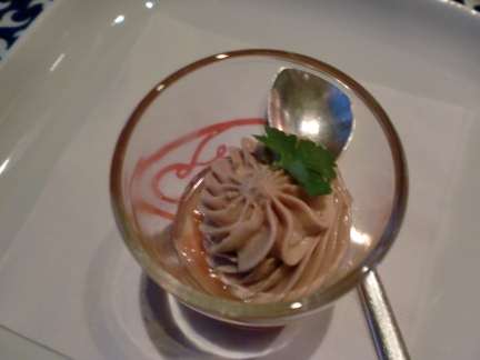 I had a pasta for lunch there, which tasted quite good. Lunch began with a tantalizing appetizer and ended with a rich chocolaty dessert. The LeCirque meal began with foie gras. I would not make a good rich person when it comes to dining choices, because I find organ meats, fish eggs, snails, and all that sort of thing quite disgusting and would never eat any of them. Or anything that requires the sort of conditions some calves and geese are subjected to. Needless to say, I did not try the foie gras. John did though, and he said it tasted awful, more so the rhubarb base than the foie gras itself. Looking around at the guests at other tables, most of them seemed to have the same reaction.