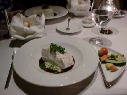 salad, something I had only read about before, but never actually tasted. It had asparagus spears and lobster of course, and some other veggies. Anything containing lobster just can’t go wrong. Next we ate sort of chef”s special soup where the waiter poured the liquid part into our bowls over top of the chunky bits right at the table. We had thick portions of halibut cooked to flaky perfection. Halibut and pinnacles, they just seem to go together. For dessert we had a scrumptious creme brulee.