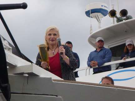 Captain Dan Blanchard, owner of American Safari and InnerSea Discoveries climbed up on a podium on the dock. He mentioned that the green color of the hulls symbolizes both the green practices of the company and the Forest Service boats of Alaska. After a bit of history on the company, and how they came back with a bang after once nearly going under, he turned the microphone over to business partner Tim Voss. He had his say and then Captain Dan introduced the captains and some crew for both vessels, as well as the ladies doing the honors of breaking champagne bottles for the christening.