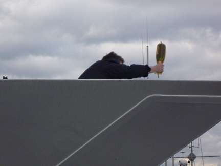 Time came near for the christening. I staked out a spot on the bow of the Safari Spirit where I had an unobstructed view of the bow of the Wilderness Discoverer, and just one pole to either work around or include in any photos of the Wilderness Adventurer.