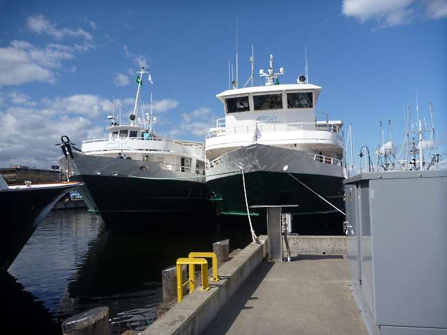 The Wilderness Discoverer sat tied to the dock, her sister ship the Wilderness Adventurer tied to her side. Behind her sat the Safari Explorer, and across from her bow the Safari Spirit, both of American Safari Cruises, the parent company of InnerSea Discoveries.