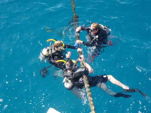John and I had the rented wetsuits from the ship. Mine had short legs and long sleeves. His had short legs and short sleeves. We started down in the water. The instructor told us to use the anchor cable to get under.