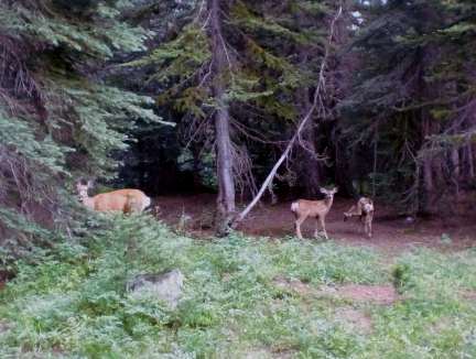 We stopped for lunch along the trail, and eventually made our way to our camp, set up in the first of a series of meadows.  Each meadow has a camp name, ours was called coon camp.  We did not see any raccoons, but it did have lots of mule deer.  A doe and her two fawns stayed right around our campsite most of the time.  At night the guides had to tightly wrap the saddles in the canvas used for the mule packs to keep deer from eating the saddle ties to get at the salt where they rub on sweaty horses.