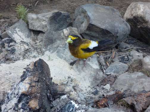 evening grossbeak on a morning firepit visit