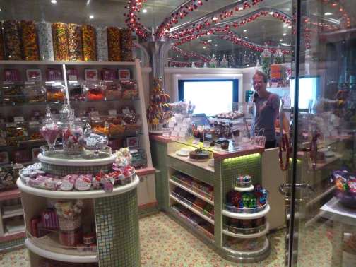 This colorful shop sells everything from m&m’s to chocolate mice. It also has a small collection of sunscreen products and other non-food items. They can help celebrate special occasions with cabin decorating or party arrangements. Welcome aboard gifts or presents for other occasions can be ordered online pre-cruise. They also can send flowers or other gift items to passengers.