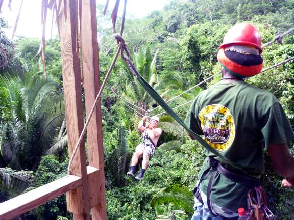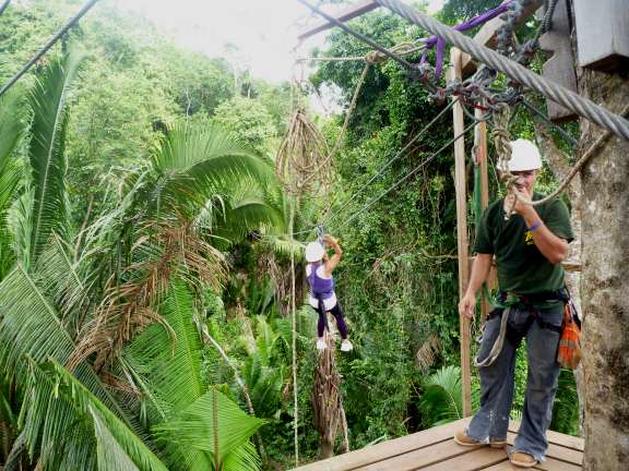 I had worn fast-drying shorts over my swimsuit and hiking shoes for the cave tubing so I just wanted my tank top, which I could have lived without. Liza though had no proper shoes as she’d hiked to the tubes in flip-flops and then rode through the caves in snorkel socks (with the flip-flops tied to her tube in a plastic bag.) Neither would work for the zip line and she didn’t travel very fast so I more or less ran to the bus and back and grabbed the bag we’d left on the driver’s seat for easy access. I got my tank top, she got her shoes and a tank top. The zip line ended and started at the same point so leaving the bag there would not have been a problem, but our cave-tubing guides offered to bring it back to the bus, an even better option. They claimed Belizians are afraid of heights, and said we’d have Mexican guides on the zipline.