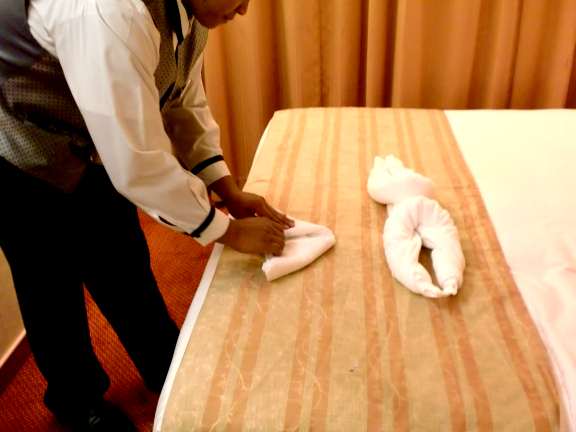 I didn’t quite get all the photos I wanted on board, so obviously I had to make a few fill-ins at home. I discovered why I had issues with the heads in my original towel folding blog, How to Fold Cruise Ship Towel Animals. My hand towels aren’t the right shape to fold into triangles and have the folds line up with the edge of the towel when folded from the center. This time I tried a smaller sized bath towel for the frog head and it worked quite well. There’s an important lesson in that, it only works if you have the right size towels.