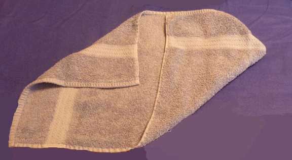 Use a hand towel for the shell on the large crab, and a washcloth for the shell on the small one.  Start the shell for the large crab by folding over two corners of the hand towel along one long side.