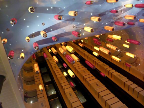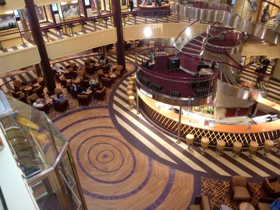 The atrium has a much more casual look than most ships. It has a bandstand on top of the bar, and colorful floating lanterns in the open area by the glass elevators. The open area is smaller than on most vessels.