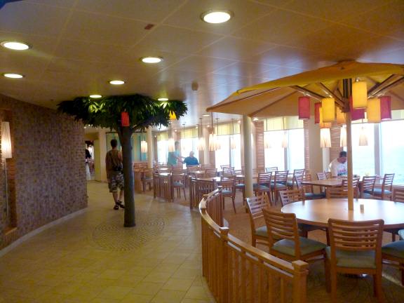 Some of the lights onboard, like the ones in the Lido Marketplace Buffet area, are designed so the light they cast resembles sunlight filtering through palm trees. The seating area has a very beachy look complete with umbrellas and trees.