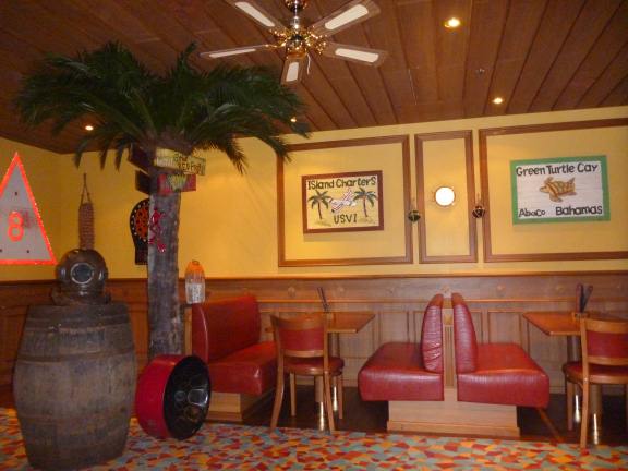 The Red Frog Pub decor is the epitomy of Caribbean casual with palm trees and nautical adornments of all sorts. It serves great food too, hot fresh and made to order for a very nominal fee. The Red Frog Pub sits on deck 5, not to be confused with the Red Frog Rum Bar on the Lido.