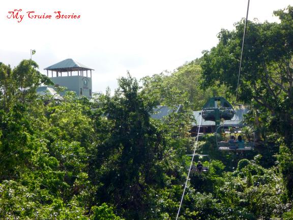 The ride on the Sky Explorer takes a bit of time and offers several views of the ships in port along the way.  A splash of purple flowers adorned the top of one tree we passed, probably one of the sort of rain forest plants that live in the trees rather than part of the tree itself.  Here and there along the forest floor large red blooms reached skyward toward the light.  The tram covered quite a distance, all of it quite scenic whether traveling through the rainforest or high enough above it for ocean views.