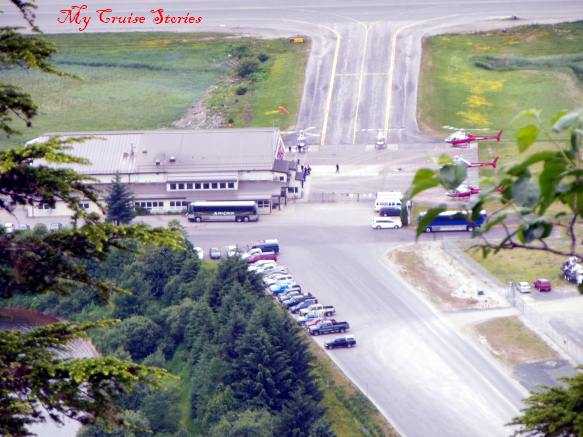 The top of the mountain brings territorial views of the surrounding area, including the cruise ships in the distance.  The lookout also offered views of the airport where we watched some helicopters and airplanes come and go.  Russ told us Juneau could claim to have an international airport as they had a weekly flight to the far distant country of Canada.