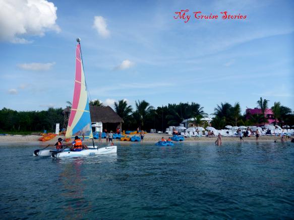The wrist bands they put on us at the start of the tour also gave us access to all the beach toys at Playa Mia.  They had kayaks and a small sailboat with a brightly colored sail as well as the paddleboats you operate with foot pedals similar to those on a bicycle.  Out in the water they had trampolines and a blow-up slide people could climb up on and either jump off or slide down.