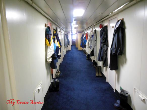 raincoats and jackets on hooks outside cabin doors with room for boots in the hall