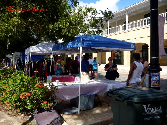 local booths set up along the water’s edge across from shops in Frederiksted, St. Croix