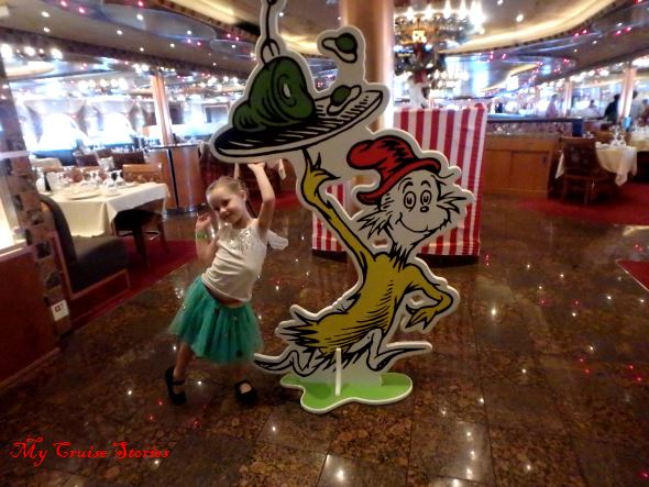 Carnival’s Seuss at Sea program is fun for kids of all ages.   It has 3 parts, a Dr. Seuss parade, Dr. Suess storytime, and a green eggs and ham breakfast. The festivities start with a parade for the kids, immediately followed by story time.  The breakfast takes place on the last sea day of the cruise and is the only part of the Dr. Seuss program that costs extra to attend.