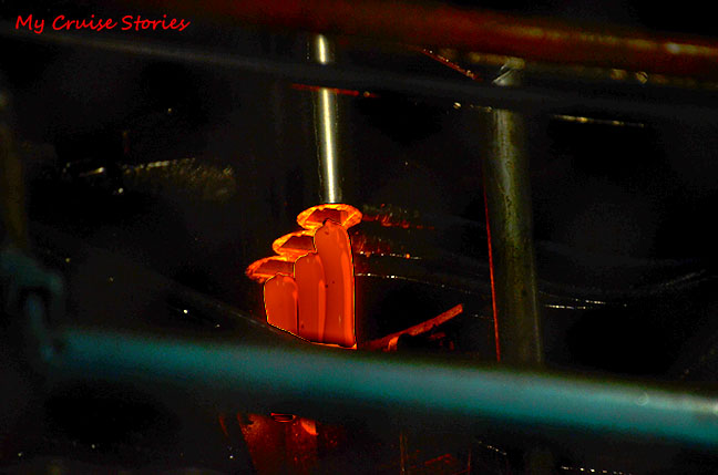 Hot molten glass bottles whizzing by on some sort of conveyer