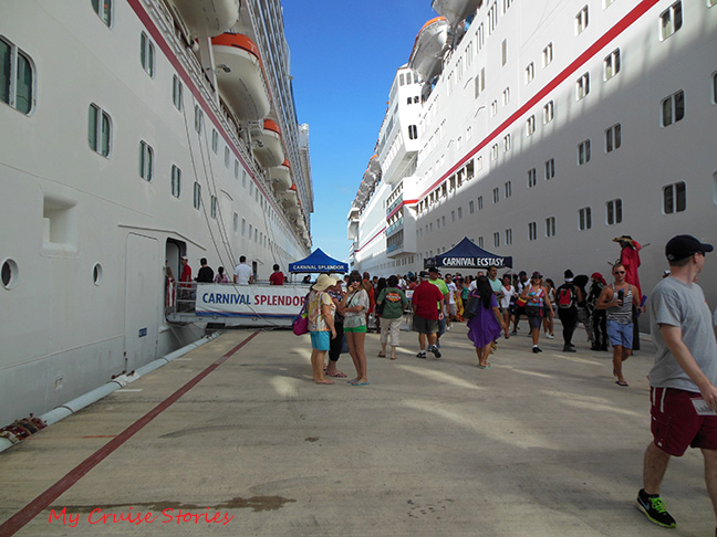 Back on the dock we saw another Carnival ship approaching. Eventually it got close enough to see the name painted on the side, Ecstasy. A smaller ship than the Splendor, but with a much taller funnel so though the top deck was significantly lower than Splendor’s, the funnel stood nearly as high. It was a slow day for Cozumel though as both the other piers where ships from other cruise lines go stood empty.