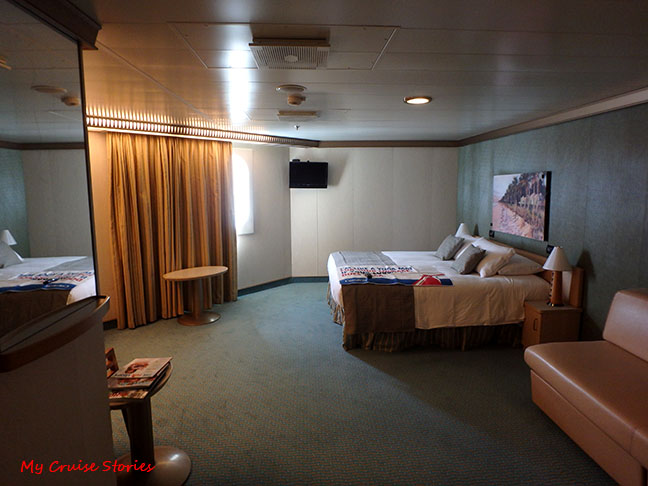 the extra-larvge curved accessible ocean view spa cabin sits in a front corner of the ship