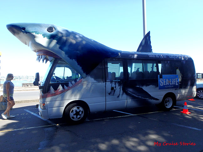 shark bus free shuttle from near the cruise docks to the aquarium in Auckland