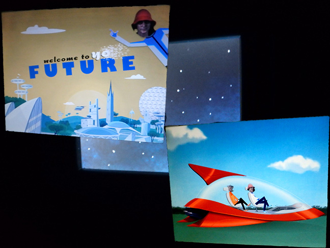 the Spaceship Earth ride keeps people entertained making a cartoon future on the way back down