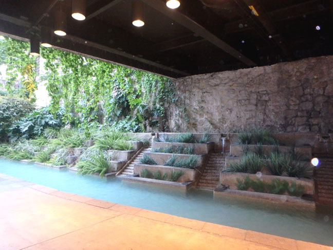 a manmade river fountain at the Hyatt Hotel in San Antonio leads the way to the River Walk