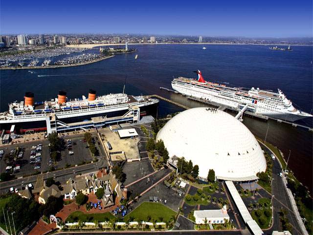 Carnival owns and operates the Long Beach Cruise Terminal. It is located next to the Queen Mary, a former cruise ship that is now used as a hotel, restaurant, bar, and entertainment venue. There are also ship tours available. Parking at the Long Beach port costs $20 per day. Hotels in the area offer park & sail packages for people who arrive by car and want to take advantage of the opportunity to stay for a night and leave their car at the hotel to save money on parking. For those who are staying in Long Beach before or after their cruise, there are things to do there in addition to visiting the Queen Mary. The city has an aquarium and plenty of shops, restaurants, and theaters. Whale watching cruises are available in the harbor.