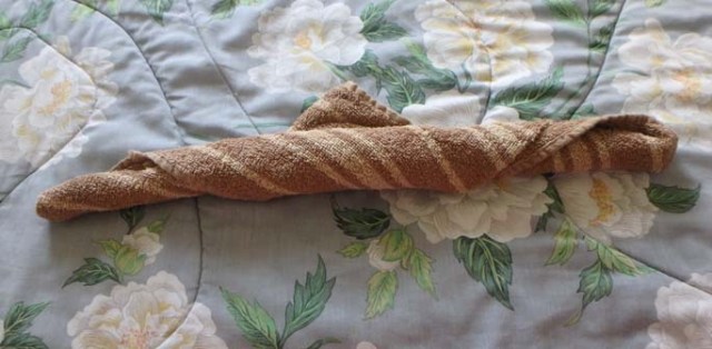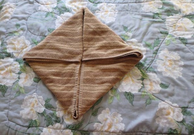 Fold towel in half across what would be the long side if the towel wasn’t folded, making a triangle.