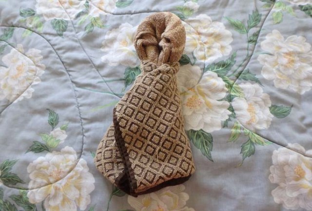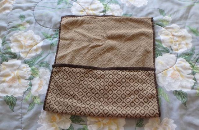 Fold 1/3 of a hand towel across the short side. Then fold the remaining unfolded third over the folded part making a rectangle. This towel can either be the same or a different color or pattern than the other two towels. I chose one with a similar color, but different pattern.