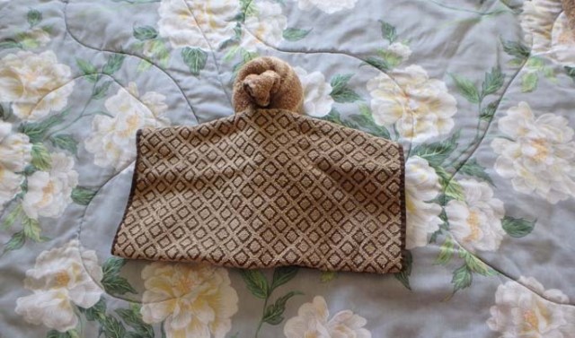 Lay center of the folded end of the towel over the long bits of the head piece. At this point it kind of like you are tucking the owl head into bed under a blanket.