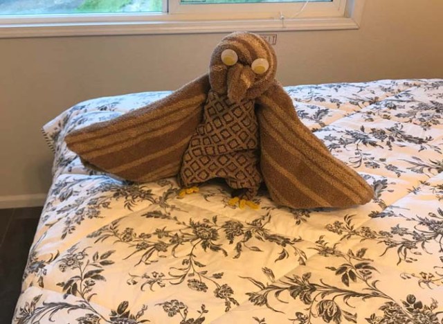 The Towel Owl is a My Cruise Stories original towel animal. It’s cute, stands on its own, and not too hard to make.