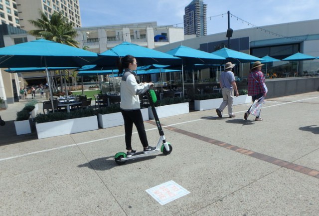 Self-powered electric scooters of the sort people stand on are available for rent. They sit along the sidewalks sometimes in groups and sometimes where someone left a lonely one. They appeared quite popular as people of all shapes and sizes whizzed by on them.