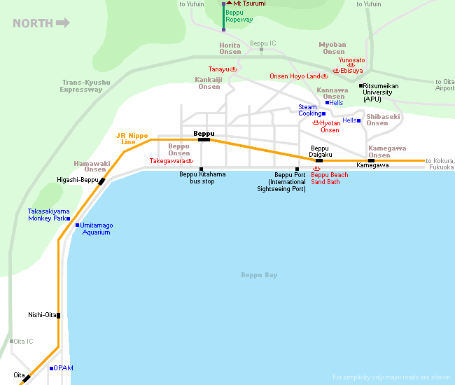 unfortunately this map of Beppu does not give distances, but it’s about a 3K walk between the 2 spots marked as hells and 8k from the farthest hell to the cruise dock by way of the lower hells