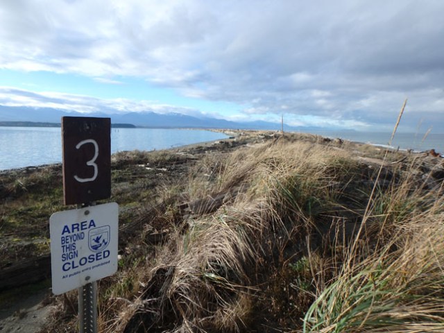 On the north coast of Washington State’s Olympic Peninsula, Dungeness Park near Sequim is divided into two sections. (Sequim is pronounced Squim – rhymes with swim.)The recreation area is a county park and has hiking trails and a campground where dogs are welcome and some trails are even open to horses. The wildlife refuge is federal and no dogs are allowed there.