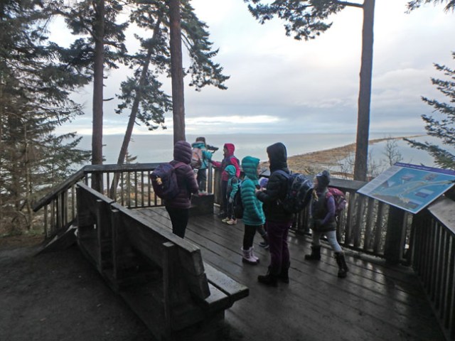 It’s free to use the trails in the recreation area, but there is a fee to camp there. Trails through the woods stay pretty much the same from year to year, but the bluff trail is an ever-changing example of nature taking its course. The park gets a bit smaller while the spit grows longer each time sand drops off the bluff. Periodically the bluff trail moves inland and sooner or later where the trail used to be is nothing but air.
