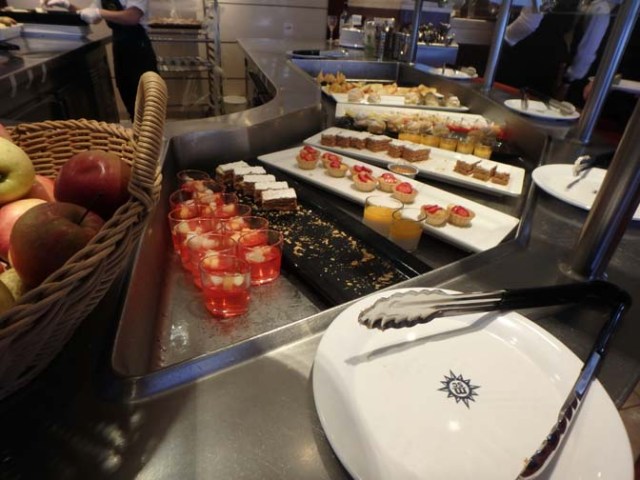 MSC is behind the times as far as gluten free food goes, at least on the Lirica. There are no specific gluten free items in the buffet, and in the dining room what’s available for asking on the spot is just packaged breadstuffs that they thaw out. They did have gluten free croissants and muffins as well as breads, but if you asked for one thing like a muffin or croissant at breakfast you got a plate of 3 (a muffin, a croissant, and a roll) and they’re heated to thaw out so if you don’t eat them fairly soon they dry out and go to waste.